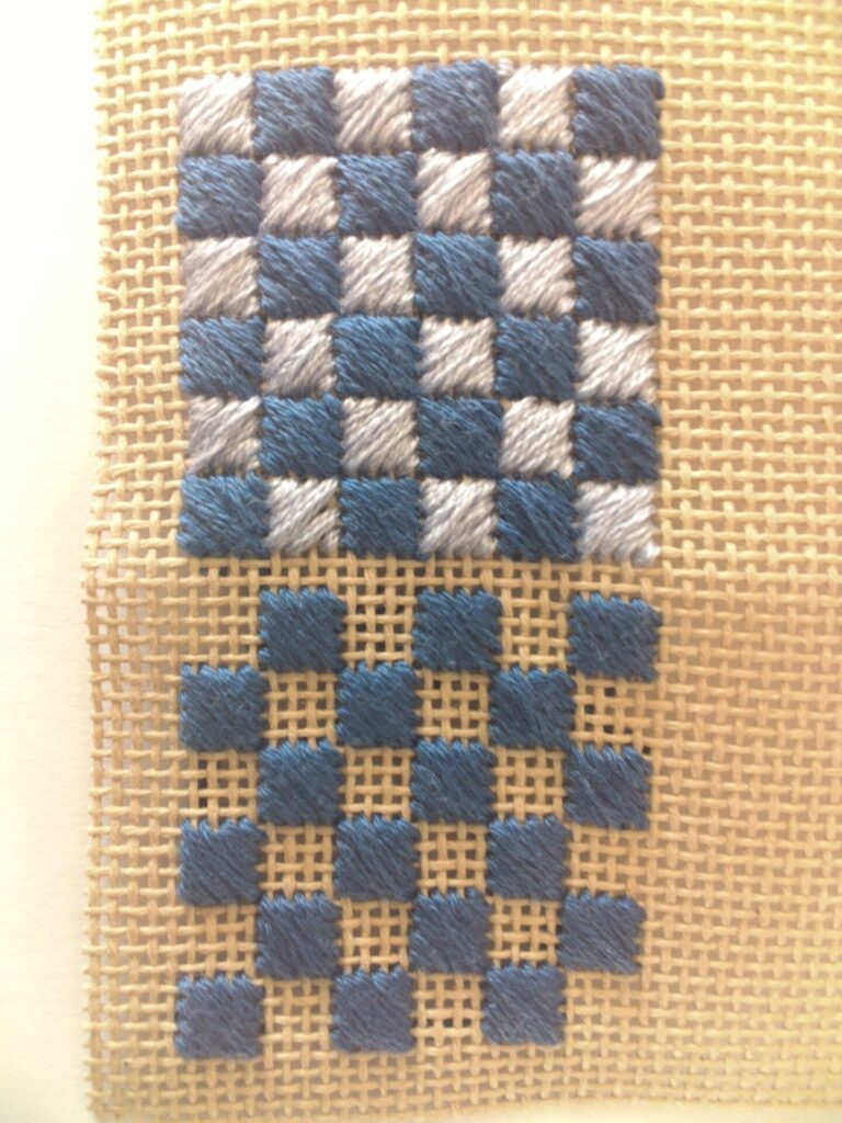 I have not done both colours in both squares as it makes it a bit clearer to see. There need to be 2 threads clear between the squares. I hope that explains it.