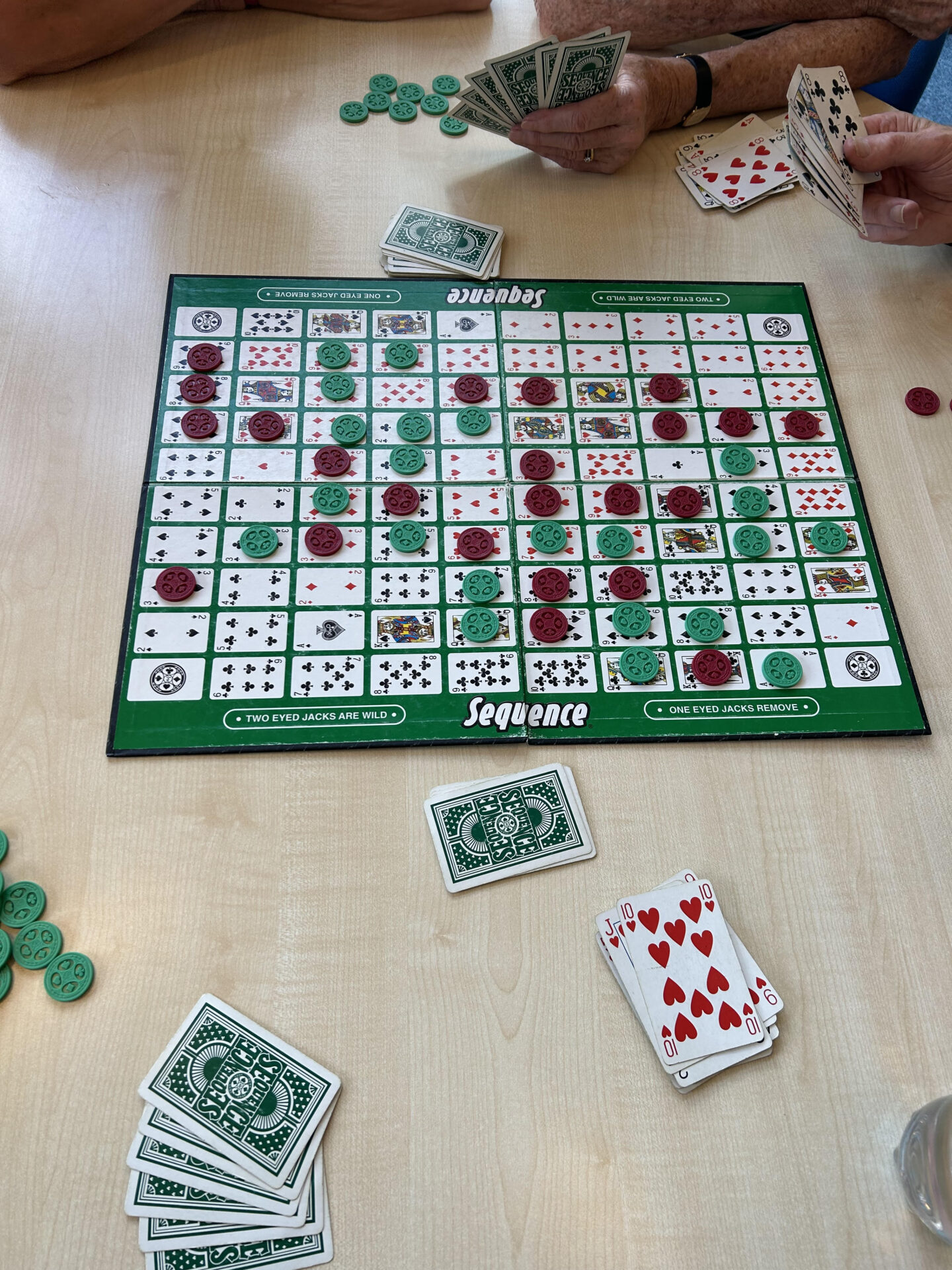 There are another two tables available for the other games or those brought along by group members. So far we have played Carcassonne, Settlers of Catan, Five Crowns, Skyjo, Querkle, Sequence and Mexican Train, plus some interesting card games.
